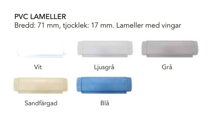 Lamellerna finns i vit, ljusgrå, grå, sand och blå. I priset ingår motor, lameller och fästen. Aluminiumställningen där lamellerna rullas upp är i borstad aluminium. APF Connect är ett tillval som innebär att du kan använda mobilen som fjärrkontroll för att öppna och stänga lamelltäcket.