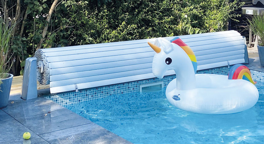 Lamelltäcket glider stilrent på vattenytan. Lamellerna är luftfyllda vilket ger isolering. Genom att vrida på en nyckel öppnas och stängs skyddet automatiskt. När poolen är täckt fäster man lamellerna med spännen på motsatt kortsida från upprullningsanordningen.